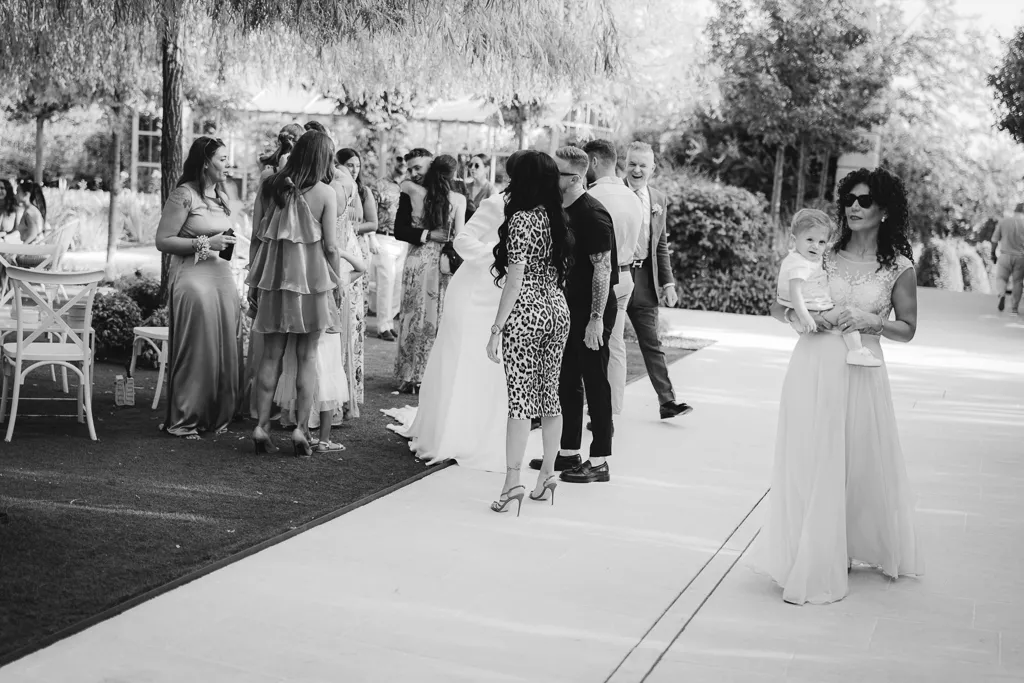 amici e parenti tutti assieme che ballano, la sposa balla con il bimbo in braccio