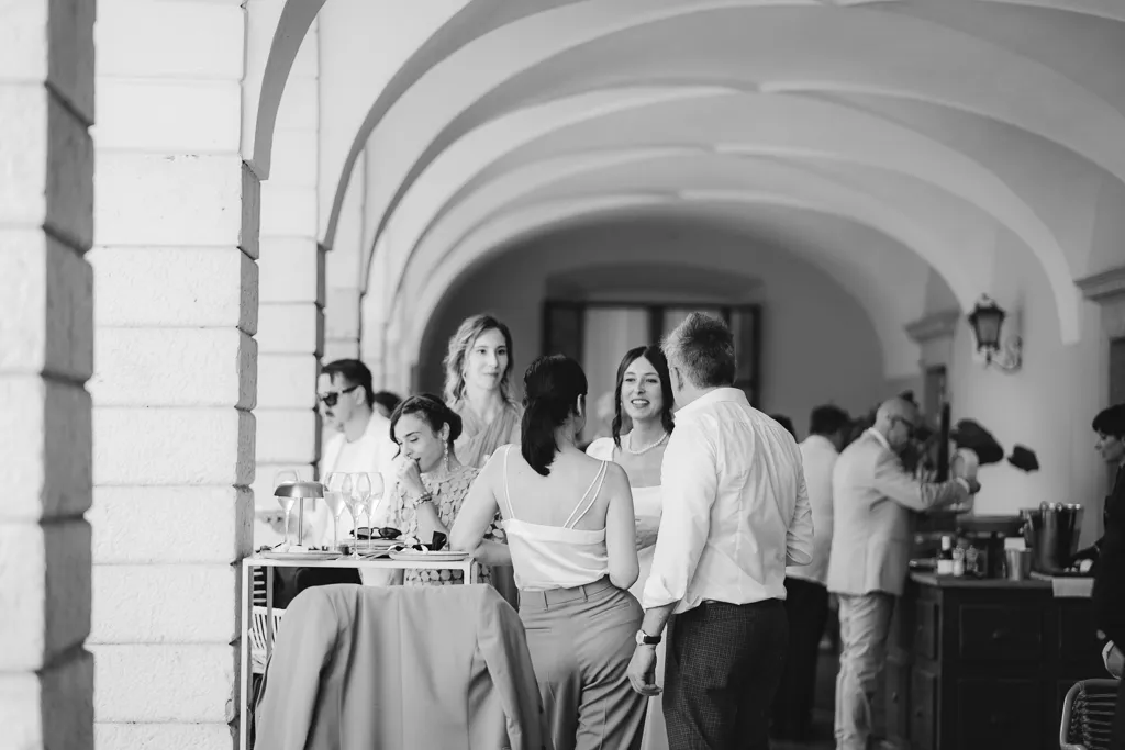 Ospiti rilassati e immersi in conversazioni durante il ricevimento a Palazzo Gambara, catturati da Giorgio Baruffi.