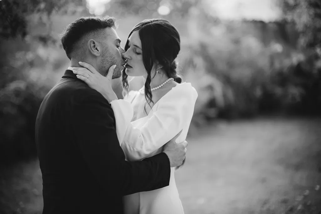 Un bacio intenso nel giardino di Palazzo Gambara, catturato dallo sguardo di Giorgio Baruffi, fotografo di matrimoni a Brescia.