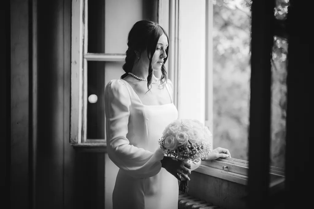 Un ritratto intimo e senza tempo di una sposa affacciata alla finestra di Palazzo Gambara. Scatto di Giorgio Baruffi, fotografo di matrimoni a Brescia.