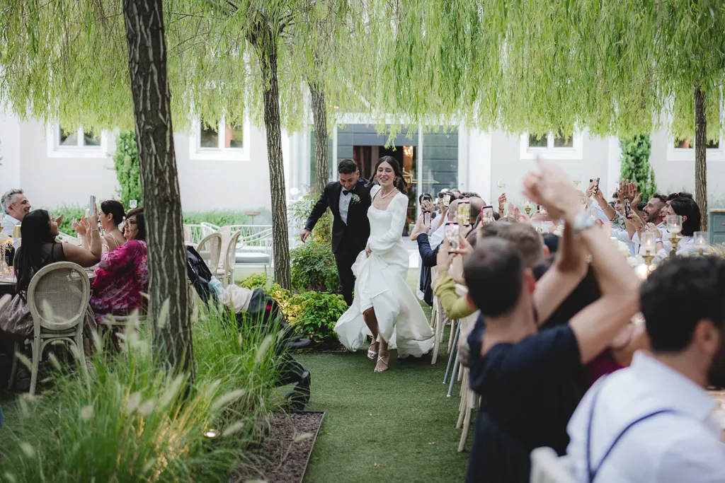 arrivo sposi di corsa al tavolo del ricevimento