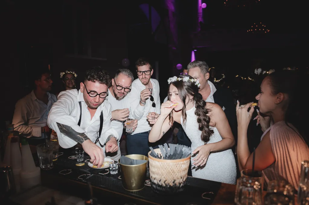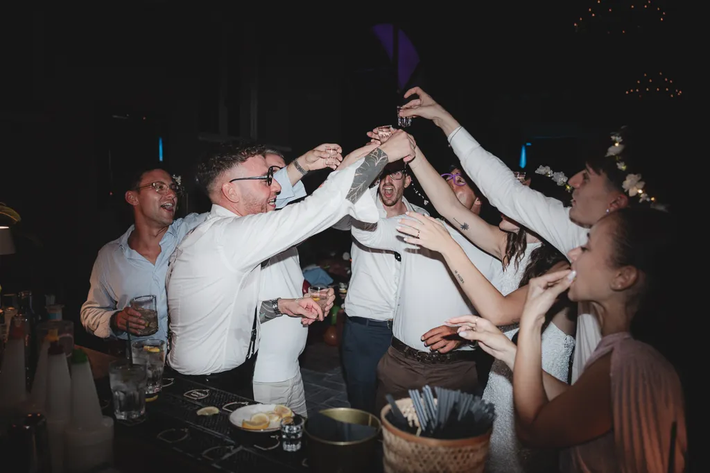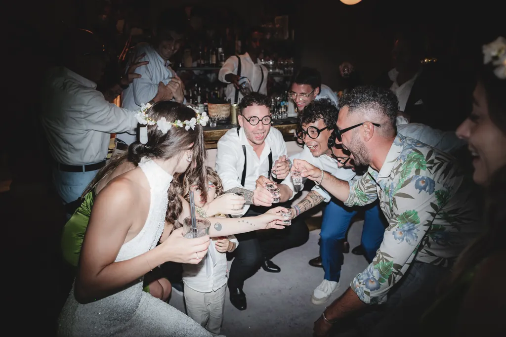 sposi e invitati bevono tequila al matrimonio